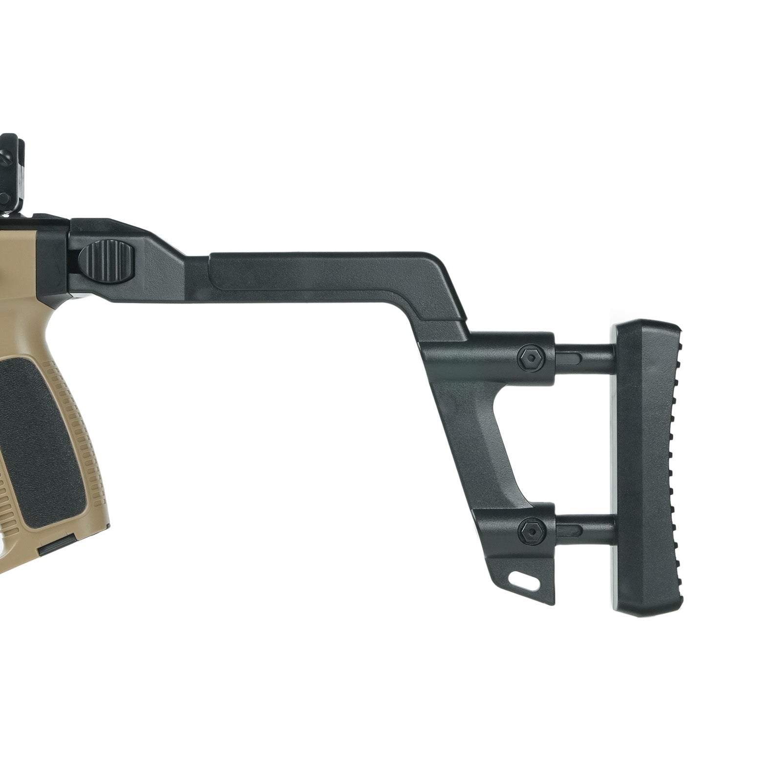 Features a contoured grip, non-slip handle, and a foldable rear stock for improved control and comfort during use. -