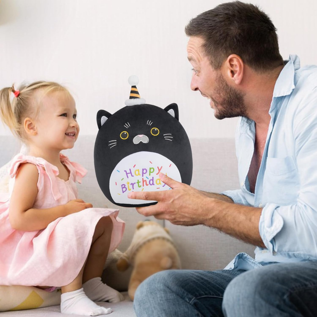 Celebrate birthdays with a touch of mysterious charm and adorable softness with the Happy Birthday Black Cat Plush! This cuddly black cat plush comes wearing a festive birthday hat and features a vibrant “Happy Birthday” message, making it a purr-fect gift for cat lovers and birthday celebrants alike.
