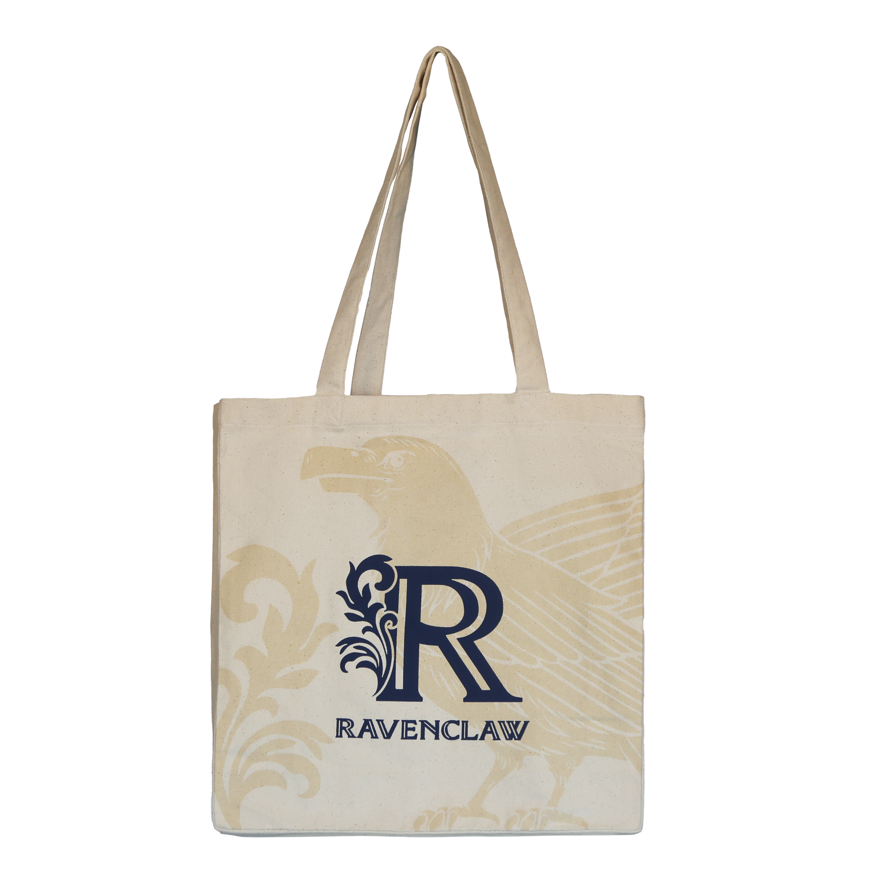 Made from 100% natural cotton, this reusable bag retains its classic canvas colour while showcasing an exclusive woodblock-style eagle design in a subtle light khaki. At the center, a striking navy blue 'R' stands in raised ink, accented by an elegant vine-like design scrolling up its back. The house name 'Ravenclaw' is printed just underneath in a bold yet delicate calligraphic font.