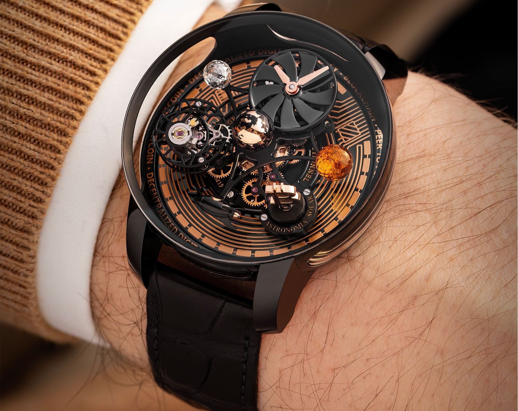 A rotating Bitcoin emblem and citrine “sun” at the dial’s core underscore its rarity—only 25 pieces in existence worldwide.
