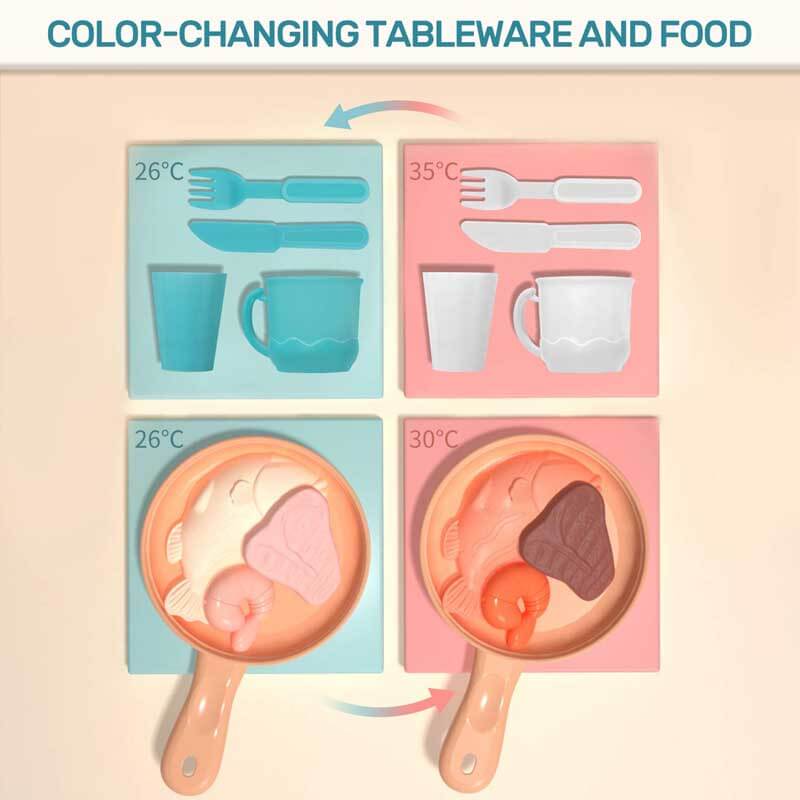 - Color-Changing Play Foods & Accessories: Kitchen Accessories will turn white when water is above 33℃, color returns when it's cool. Play foods(Only fish, steak, shrimp ) will gets darker when water is below 26℃, color returns when it's cool, which provides a realistic cooking effect.
