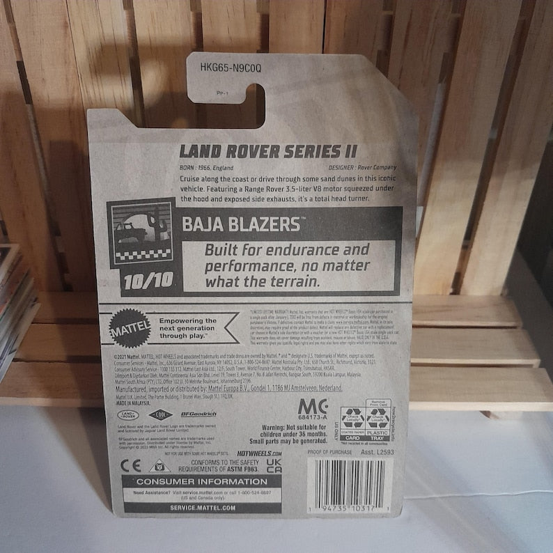 Gear up for adventure with the Hot Wheels Land Rover Series II, a 1:64 scale die-cast model inspired by the iconic British off-roader. Part of the Baja Blazers series from the 2023 mainline collection, this rugged vehicle features a realistic artichoke green paint job with off-road graphics, roof surfboard detail, and a rear-mounted spare tire.