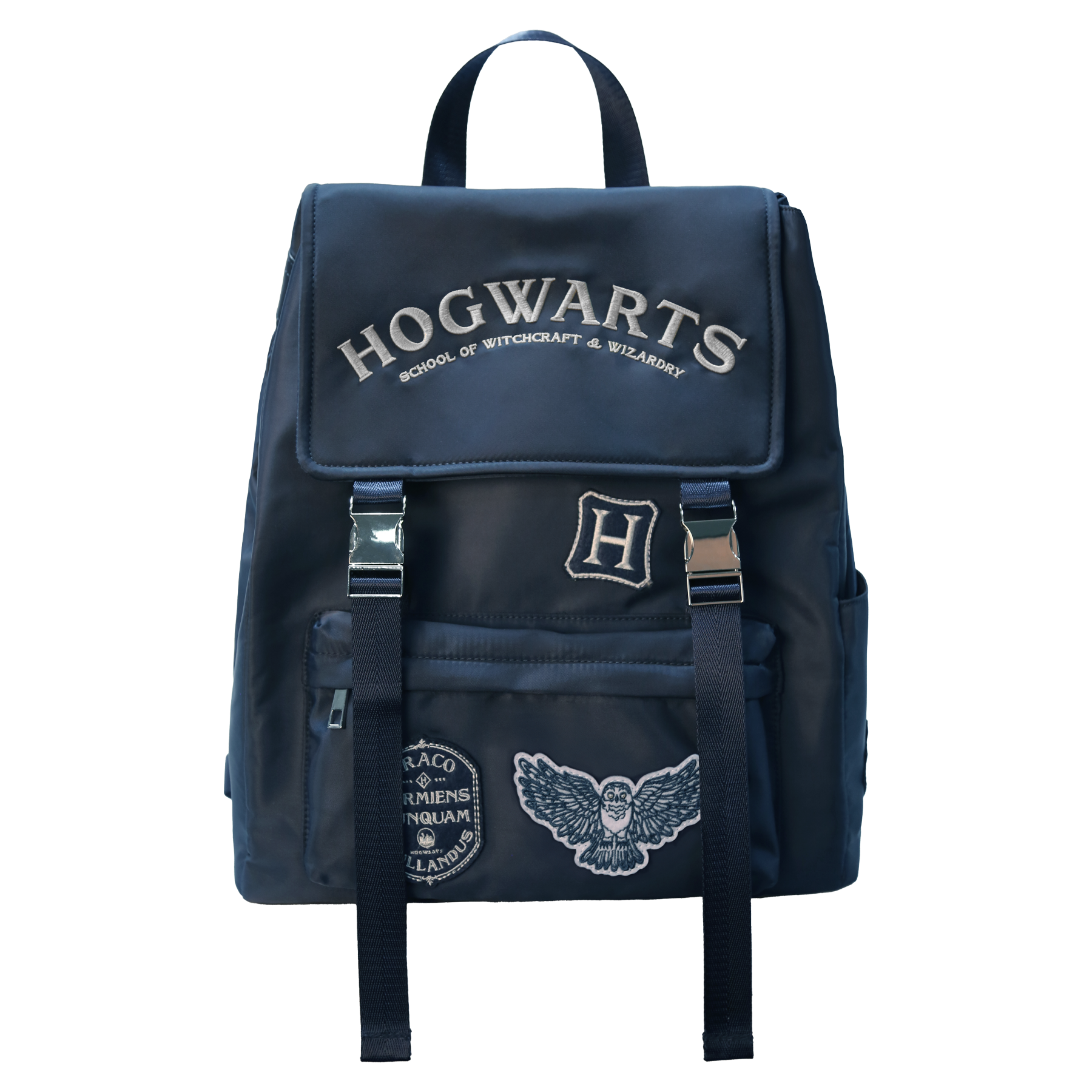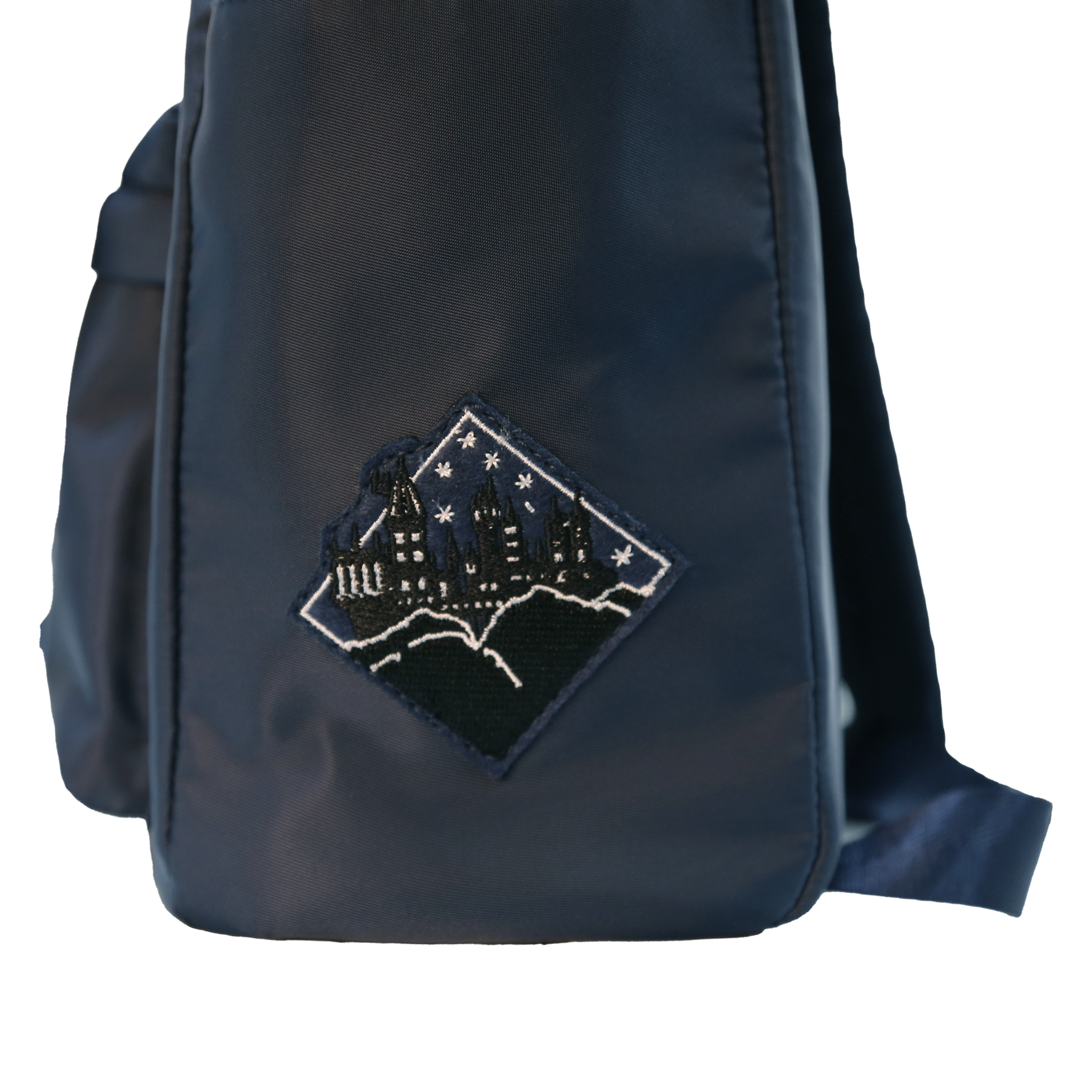 Four exquisite patches with artwork unique to the Magical Hogwarts collection adorn he outside, while in silvered tones the embroidered words "Hogwarts School of Witchcraft and Wizardry" grace the front flap closure. Adjustable silver buckle detailing and double-snap strapping keep your treasures secure, even during the most daring quests.