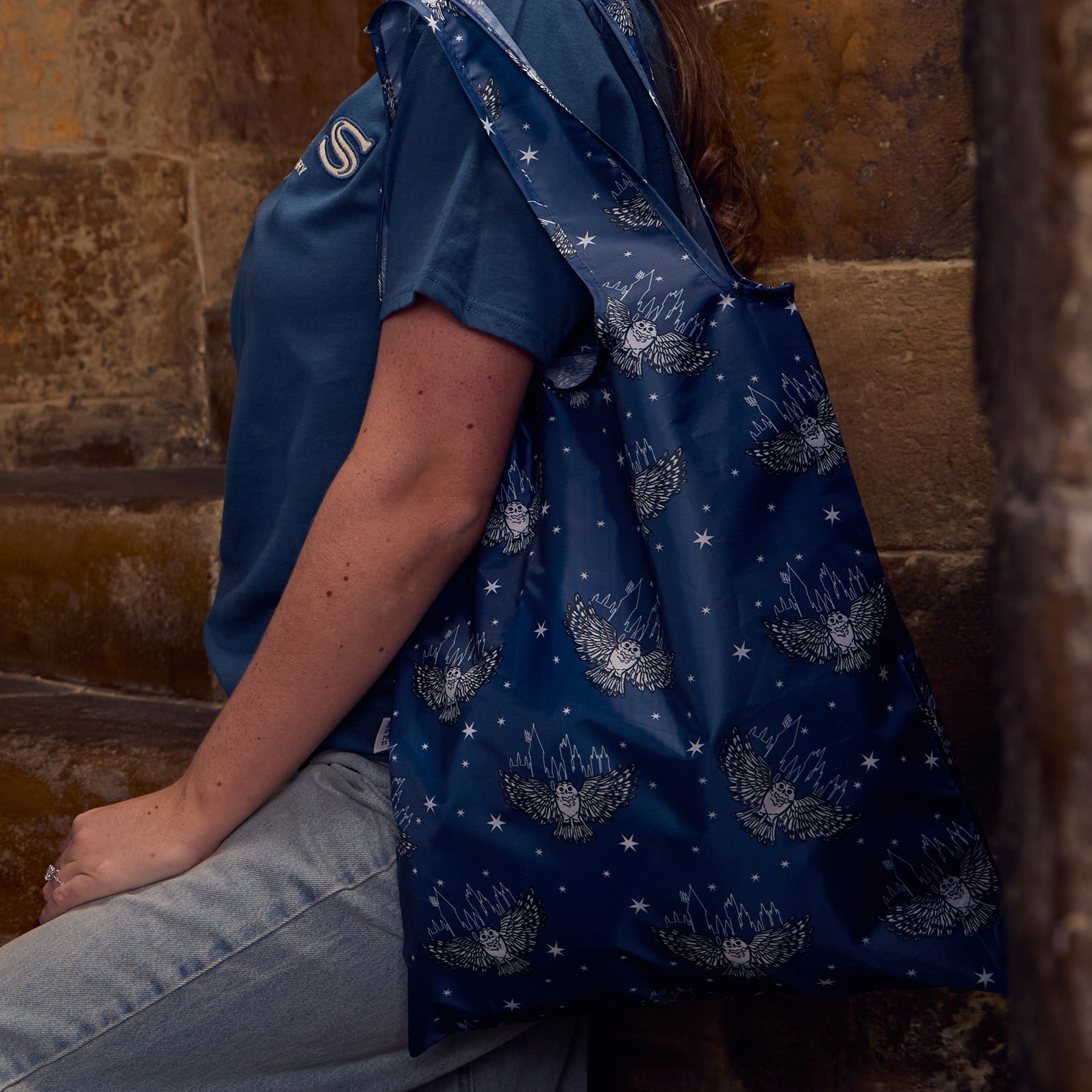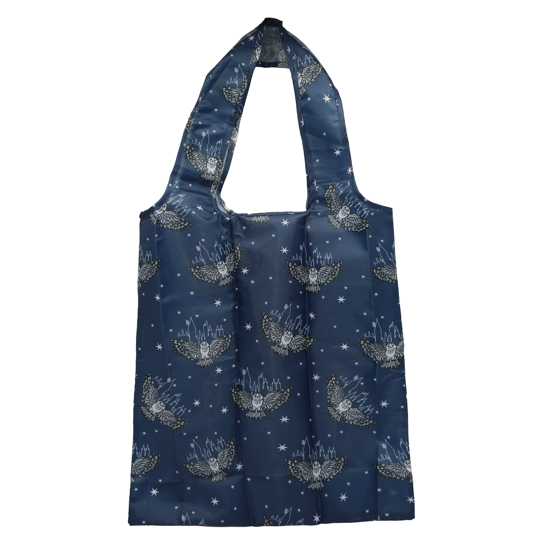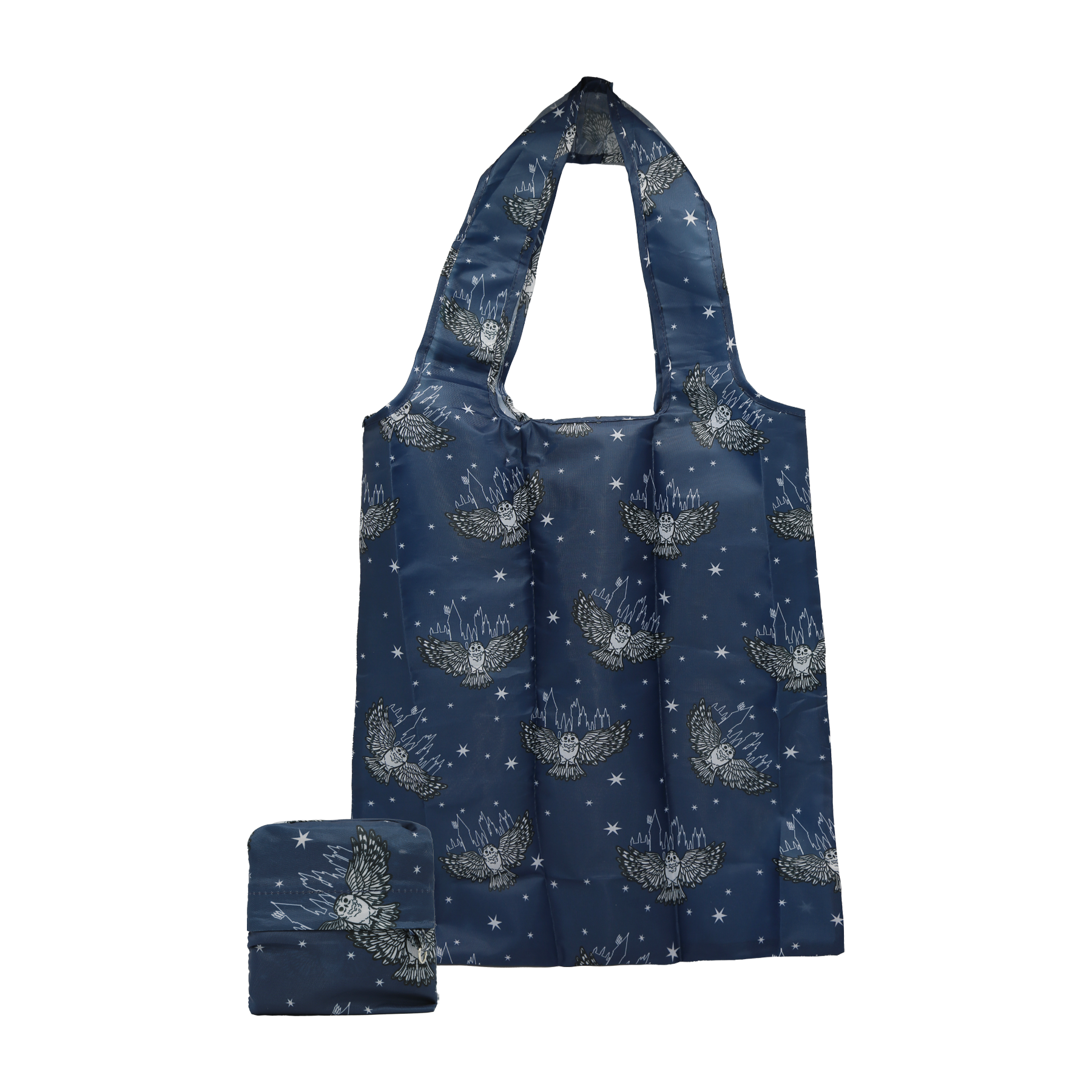 When not in use, the bag conveniently folds away into a compact, self-contained pouch with a small d-ring, allowing you to clip it to your bag or belt for easy access. Unfurled, the bag has a 28cm strap to ensure a comfortable over the shoulder carrying experience. Made from eco-friendly RPET Polyester, it combines durability with sustainability, perfect for everyday journeys or quick escapes to Diagon Alley. Exclusive Magical Hogwarts artwork of Hedwig and Hogwarts castle are featured in an all over print.