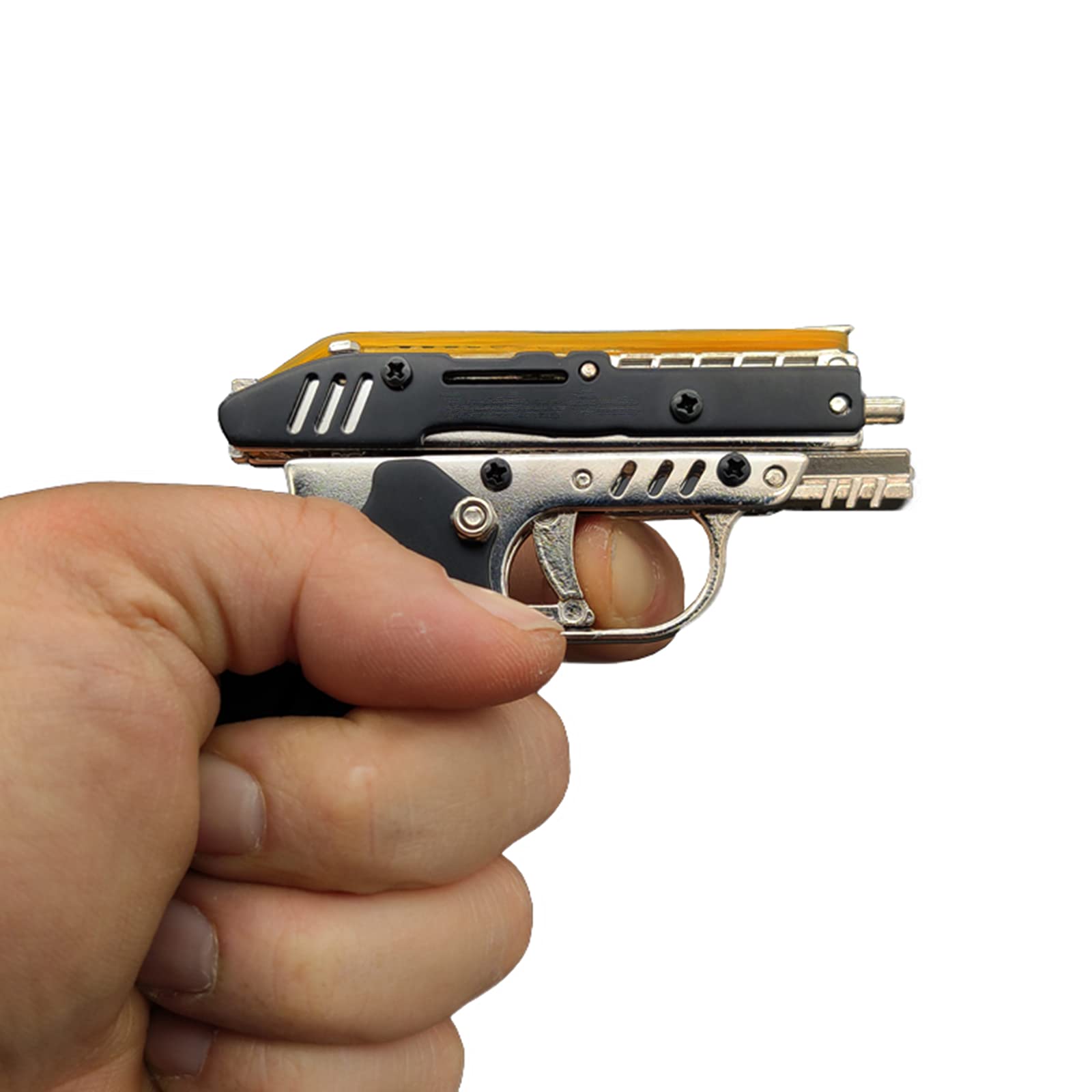 The New Generation Upgrade Mini Metal Foldable Rubber Band Gun is a stylish and durable toy designed for ages 12 and up. Made from high-quality zinc alloy, this keychain accessory features a foldable design and shoots special rubber band 'bullets' with impressive elasticity and a range of up to 10 meters. Perfect for both play and display, it offers endless entertainment and makes a great gift for friends and family.
