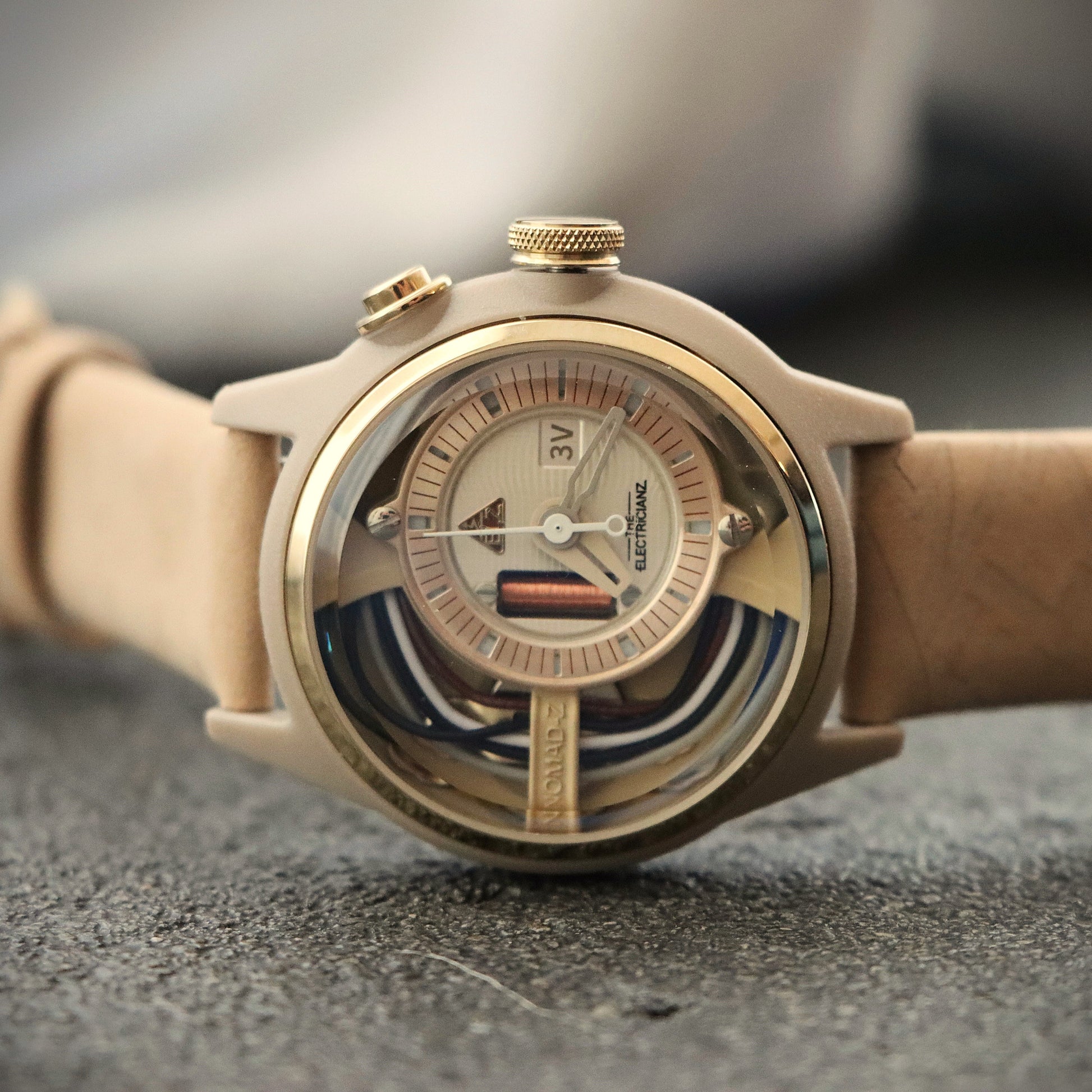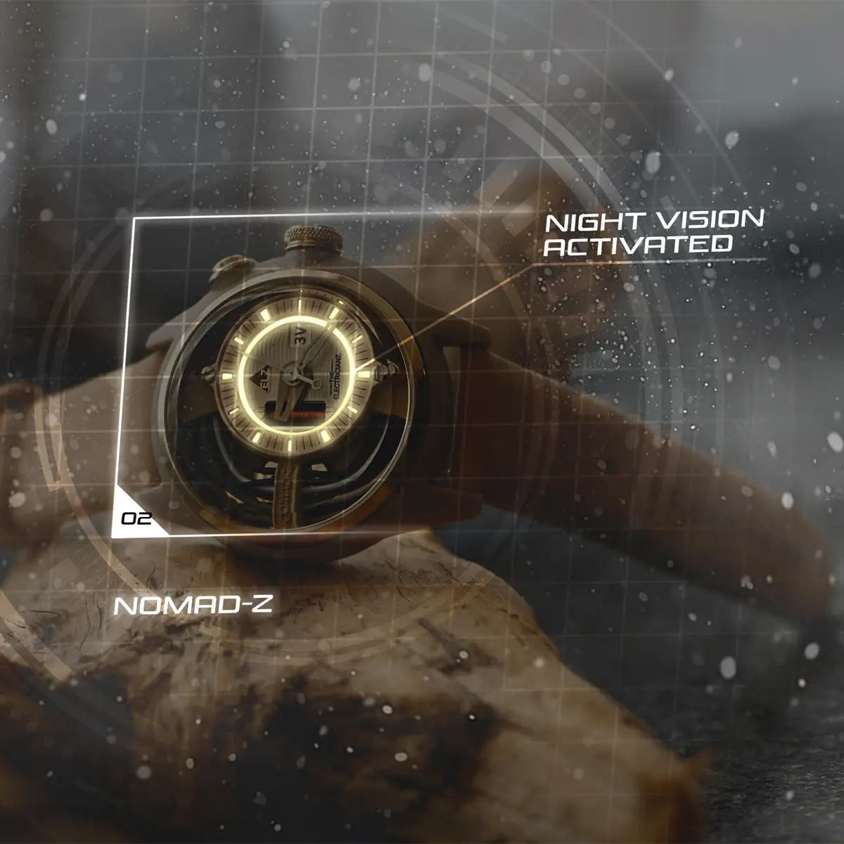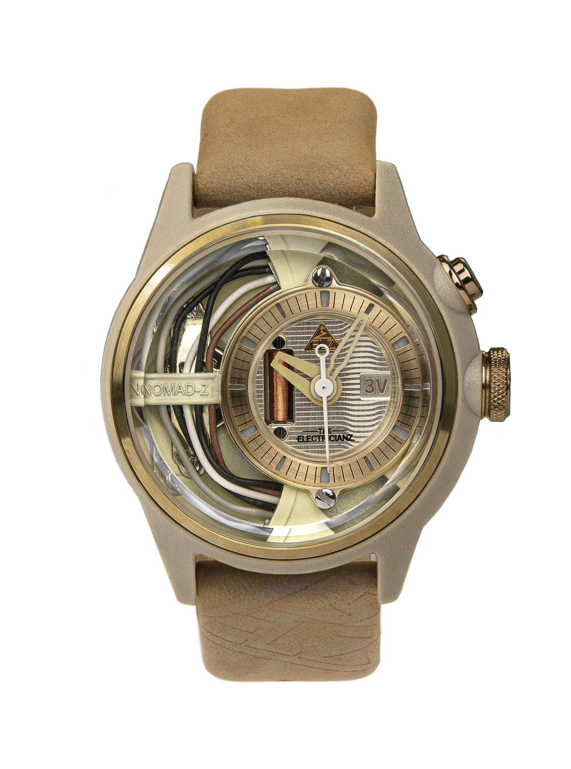 The Nomad-Z: A sumptuous velvety leather embraces the Nomad-Z delicate case. Spring colors elegantly enhance the volume of the watch, putting forth its depth and roundness. It's a real Electricianz and its true power is revealed at night. You were warned!