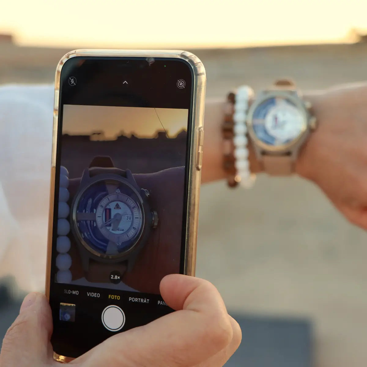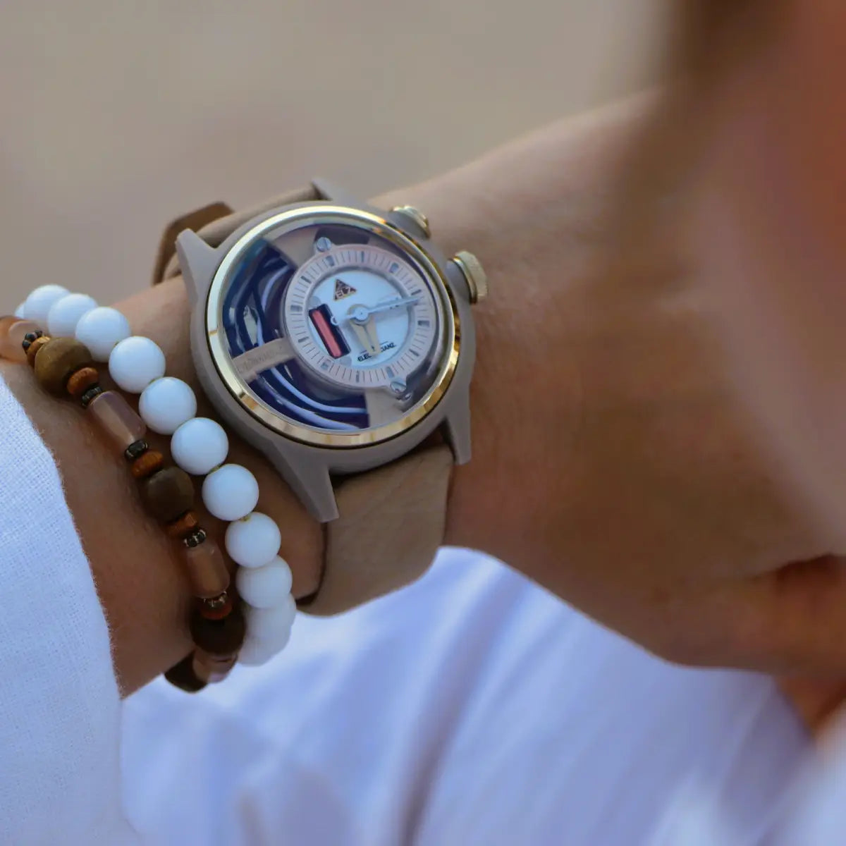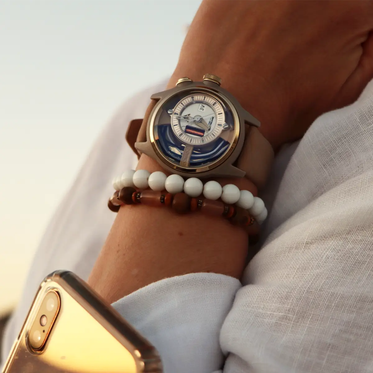 The Nomad-Z: A sumptuous velvety leather embraces the Nomad-Z delicate case. Spring colors elegantly enhance the volume of the watch, putting forth its depth and roundness. It's a real Electricianz and its true power is revealed at night. You were warned!