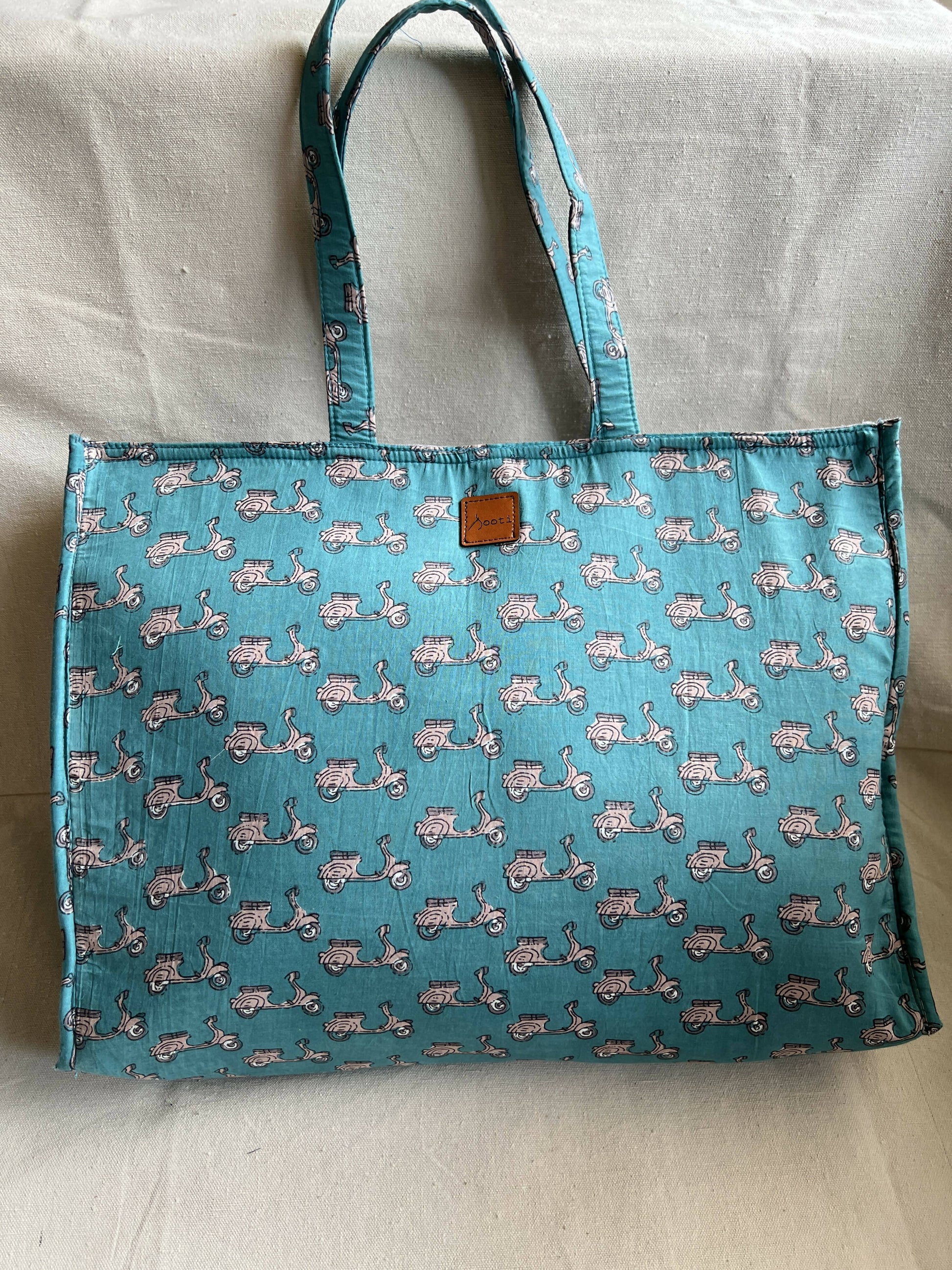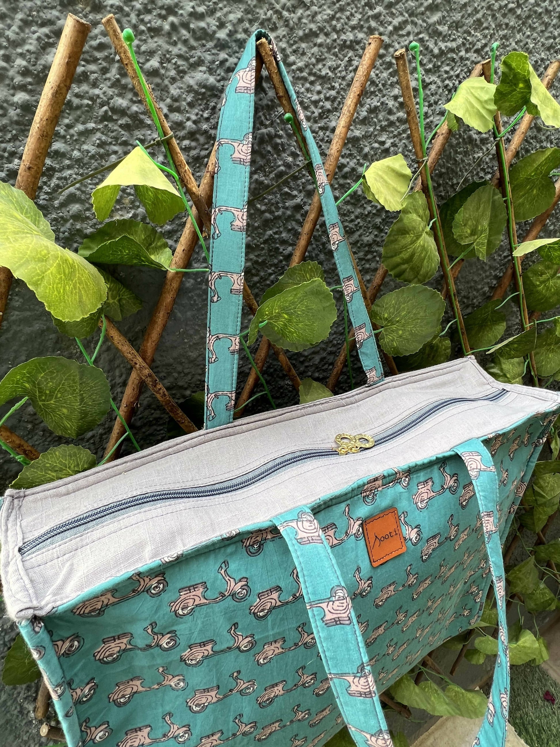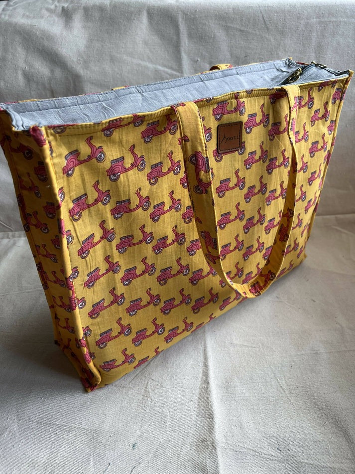 Vespa printed tote bags with colors and prints you cannot miss! Made from cotton printed quirky fabrics which can accommodate all your needs. Use this one for office, shopping, travel or hospital visits inside as it comes with a bottle holder, 2 slip in pockets and 1 zip pockets and a loop to hang your keys.