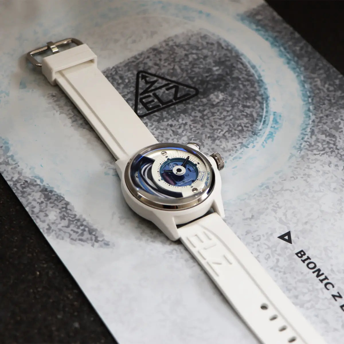 Crafted with precision and elegance, the Bionic Z Edition is housed in a sleek 42mm stainless steel case, enhanced with a refined white MAT ceramic exterior that's been injected into a robust nylon sheath. With its hardy construction, this watch resists abrasion and stress cracking, and its paraffin-like structure ensures a soft, silky touch.