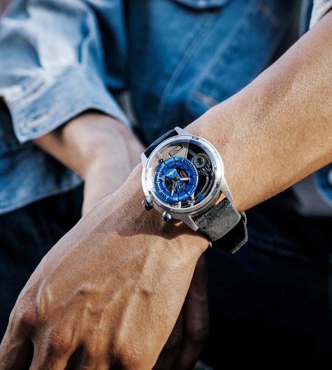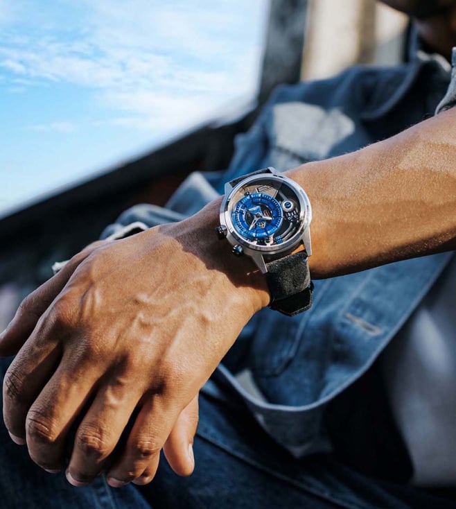 The watch’s bold gunmetal stainless steel case and matte blue dial are complemented by exposed cables on the face, symbolizing electricity and energy. This unique design appeals to those who want a modern, edgy accessory that stands out from conventional timepieces.